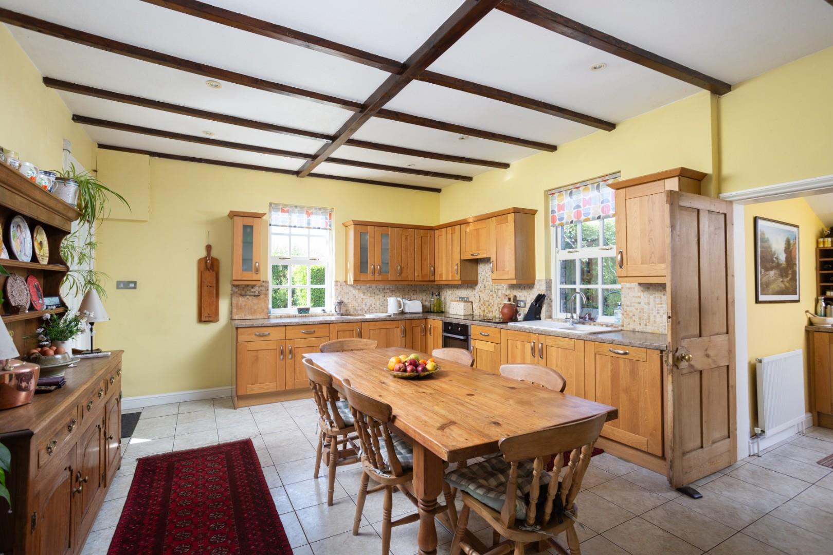 One of the feature rooms of the property is the farmhouse style breakfast kitchen, which has a range of built-in high and low level storage cupboards with tiled splashbacks, laminated worktops and inset ceramic sink unit. There is a floor mounted ESSE cooker in addition to a built-in Blomberg oven with 4 point induction hob and extractor. The kitchen also includes a built-in fridge unit and integrated dishwasher. There is ample space for a freestanding dining table as well as recess ceiling down lighters, feature exposed beamed ceiling, radiator, and tiled flooring.