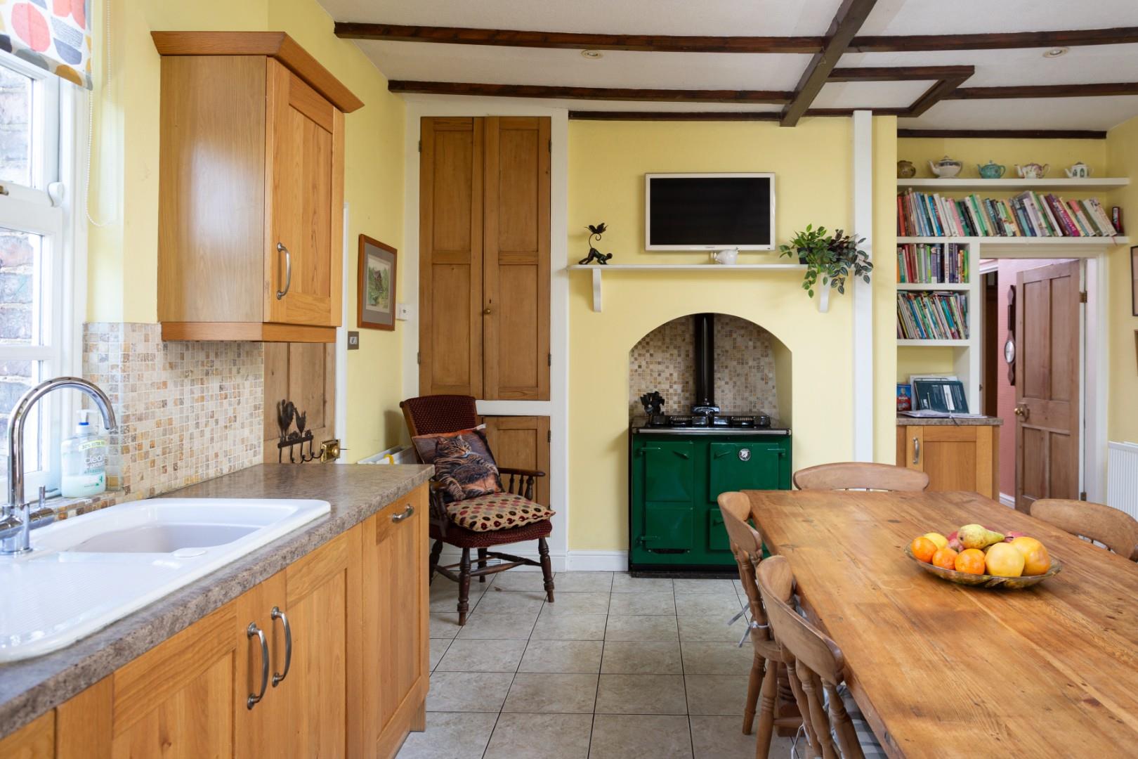 An inner hall accesses the rooms located at the rear of the property which includes a central sitting room, which has a feature cast iron fireplace with Adam style surround. The sitting room has a range of book shelving, in addition to double radiators, low level storage cupboards and dado rail. The principal reception room is a spacious lounge, located at the rear of the house, which has a further solid fuel burning cast iron stove set on an exposed brick hearth. A bay window overlooks the side garden, and the room includes 2 radiators and television point.