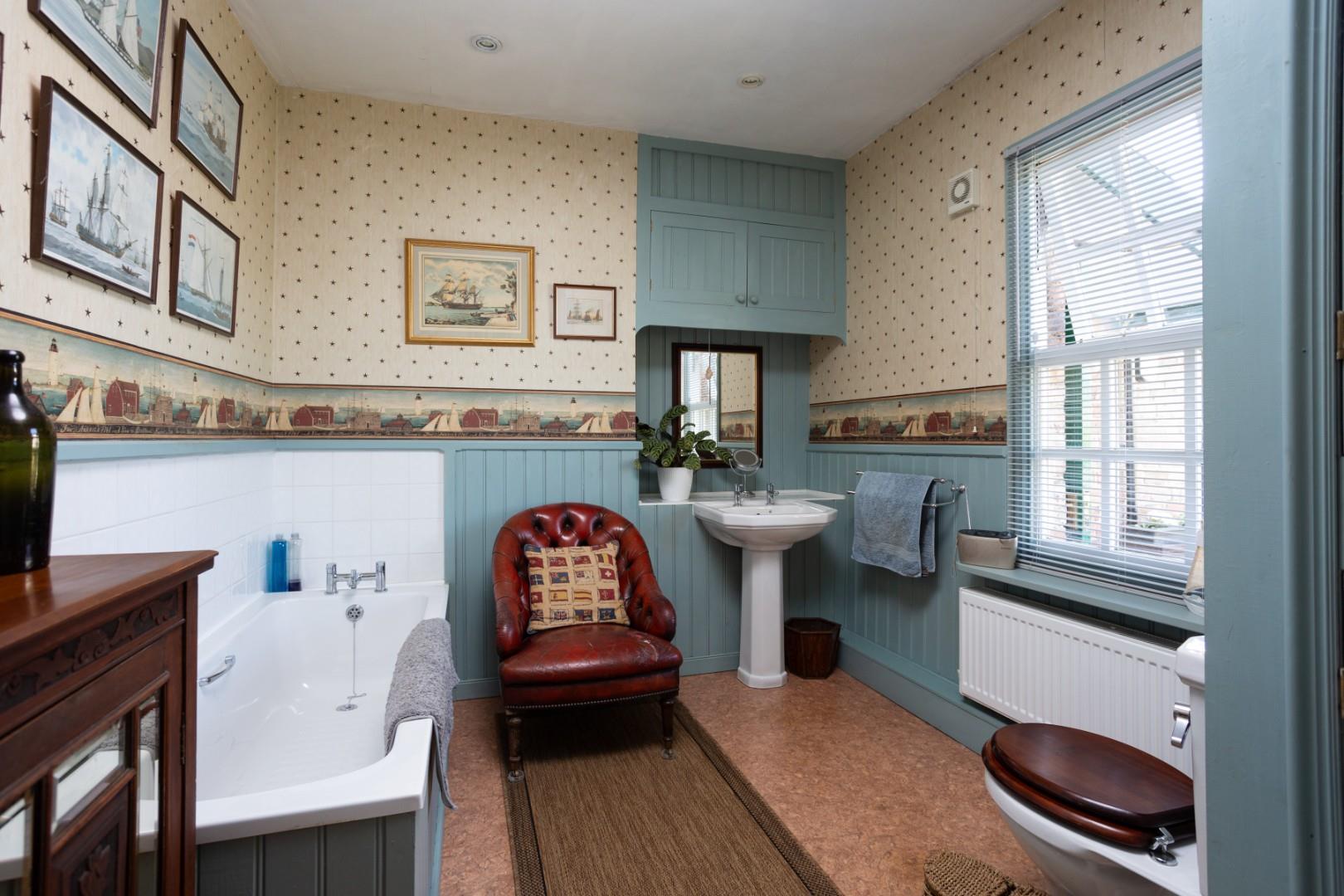 There is a walk-in linen and storage cupboard, with the internal accommodation completed by a house bathroom which has a low flush W.C, wash hand basin and inset panelled bath with tiled splashbacks. The bathroom features a wood panelled surround, a double fronted linen cupboard which houses the Worcester oil fired central heating boiler.