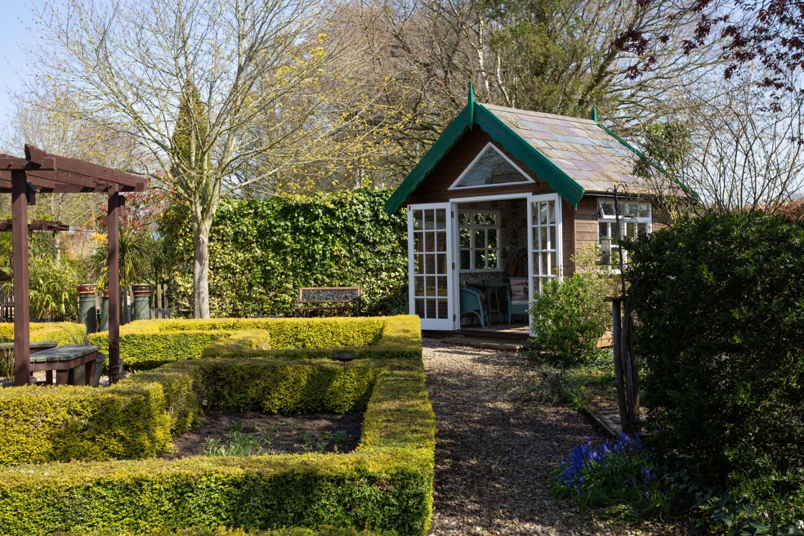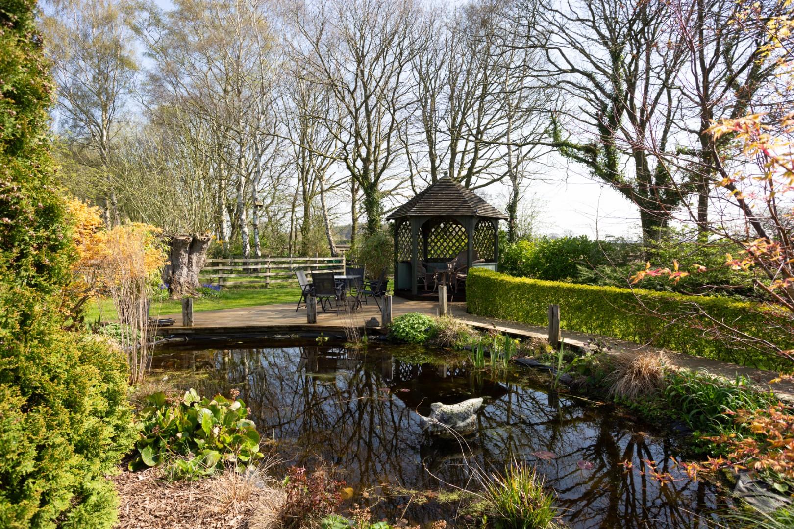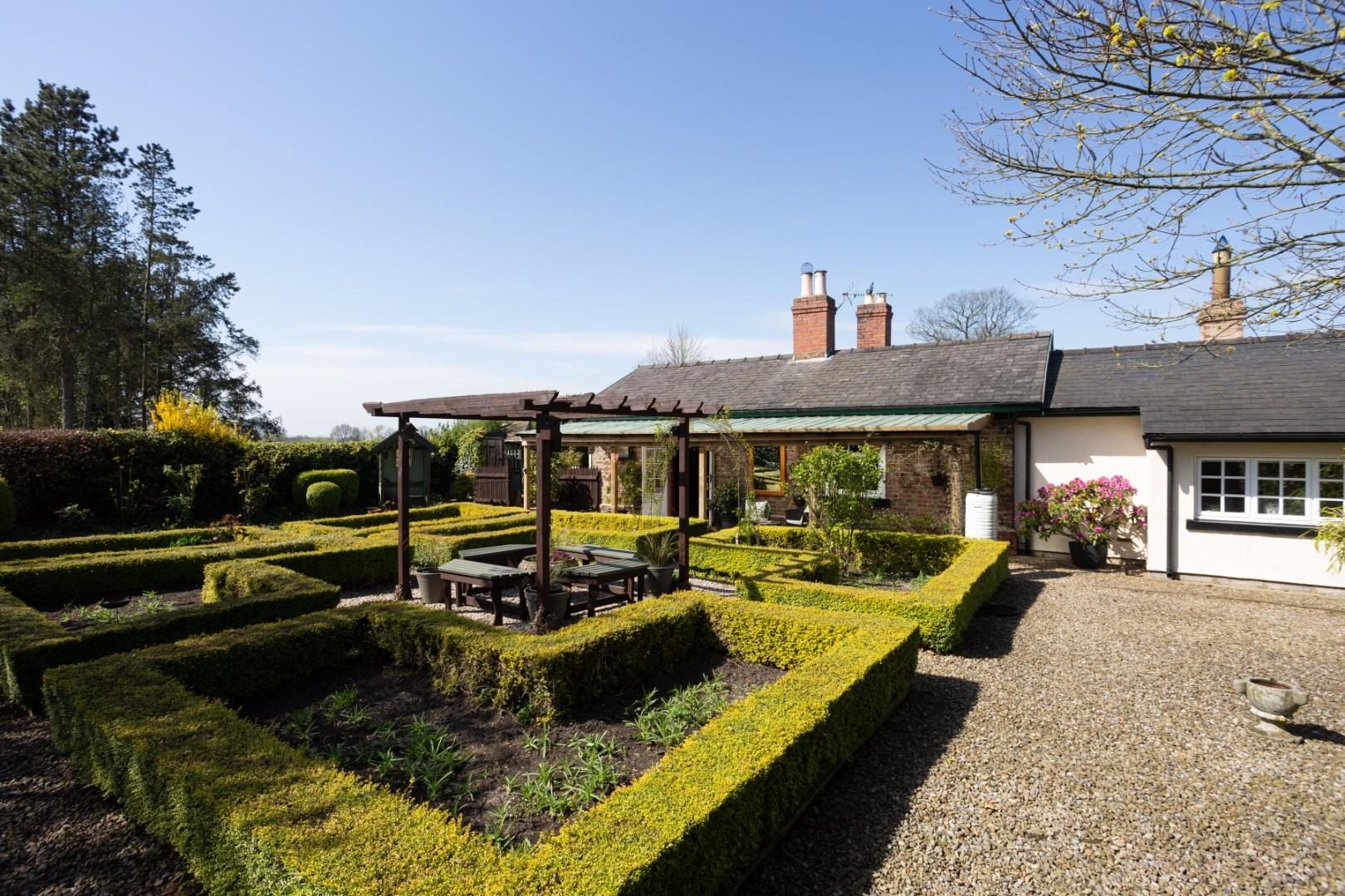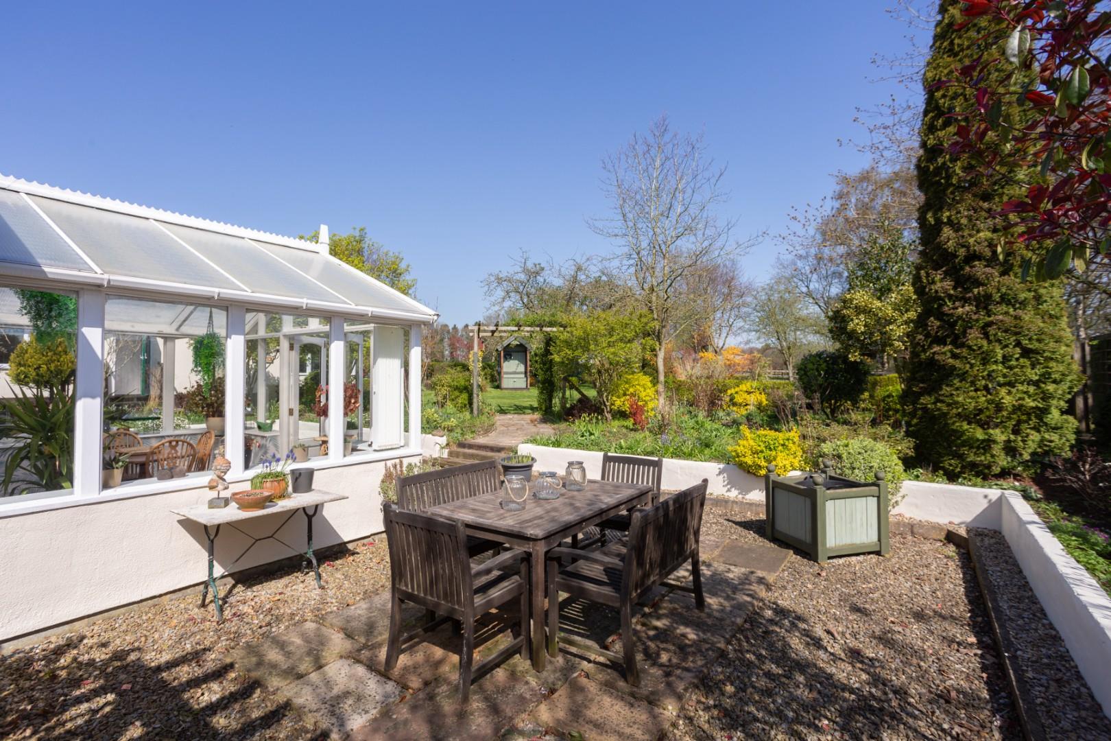 Adjoining the side elevation is a covered pergola, which looks out onto a boxed hedge maze garden, with central seating and surrounding planted borders. A timber-built summer house overlooking the side garden is included within the sale. There is a flagged patio and seating area to the rear which steps up onto a central garden being extensively lawned with central fishpond, decked patio, and covered seating. Thereafter, the rear garden stretches to approximately 100m in length with a selection of lawned areas, planted beds and raised vegetable gardens. There is a tree lined walkway which leads through to the end of the garden which boasts a superb open panoramic aspect.