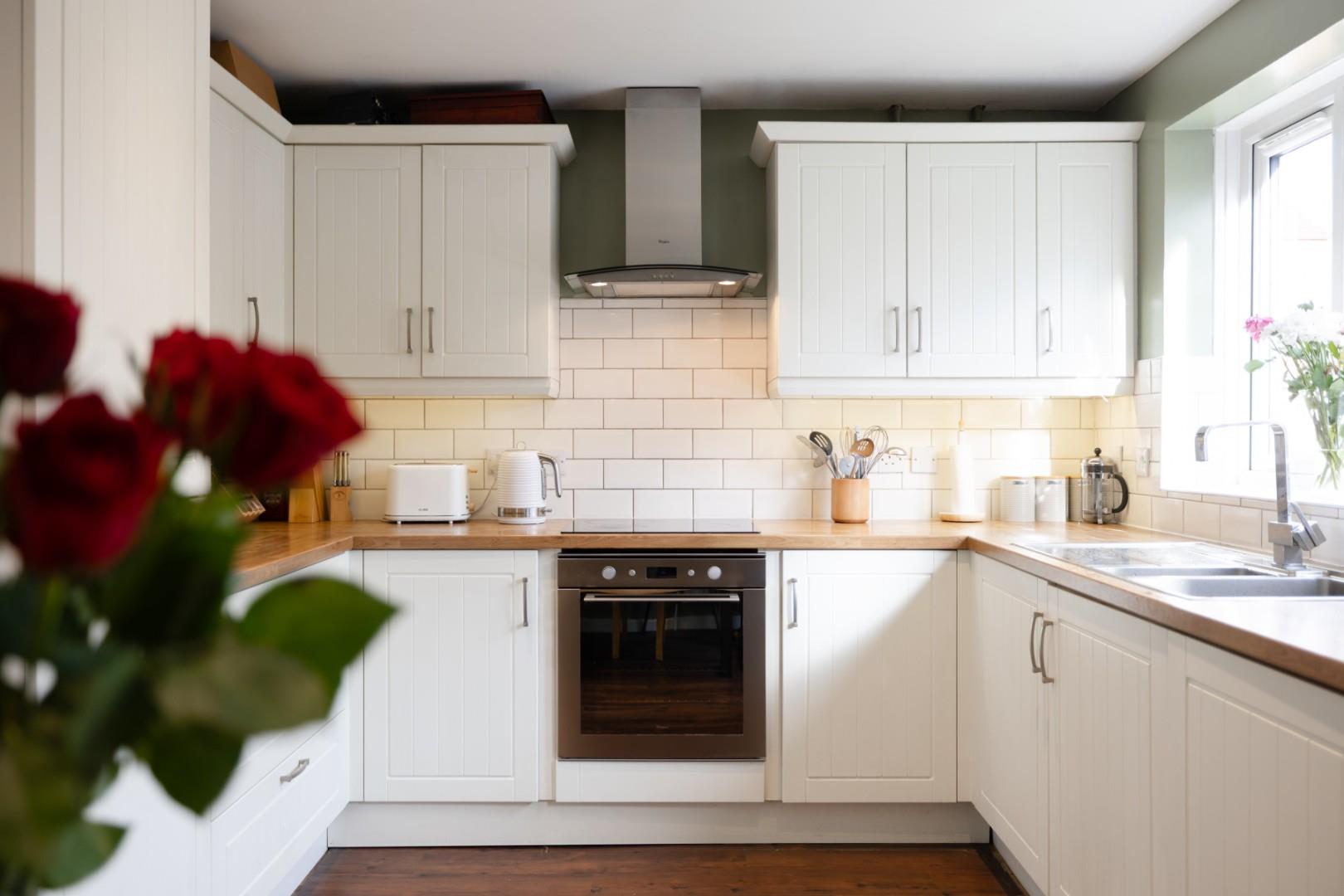 The modern kitchen features an extensive range of wall and base units arranged across three sides, finished with sleek laminated work surfaces. Integrated appliances include a ceramic hob with oven and extractor hood, a 1? bowl stainless steel sink, washer dryer, and fridge freezer. The adjoining dining area, illuminated by recessed ceiling spotlights, provides a perfect space for family meals or entertaining guests, with single doors opening directly onto the landscaped rear garden.