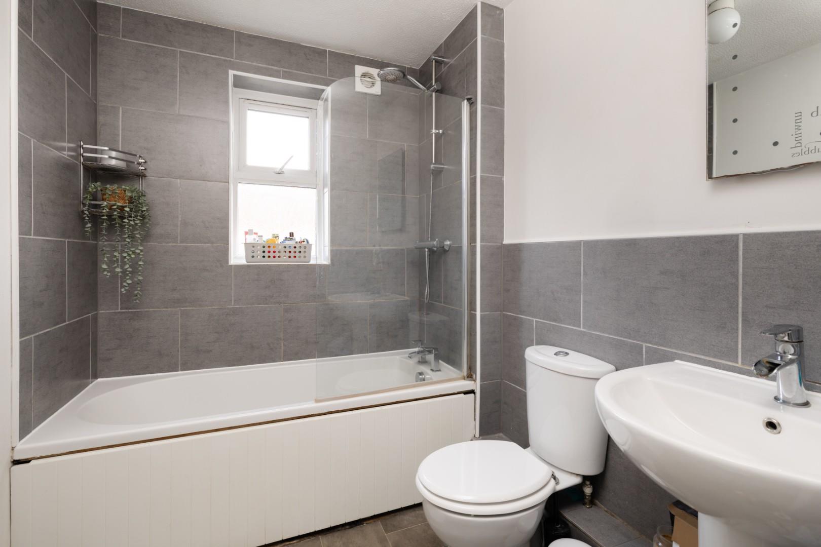 The family bathroom is stylish, comprising a three-piece suite with a panelled bath and mains shower over, low-flush WC, and pedestal wash basin, enhanced by tasteful tiled walls and a single radiator.