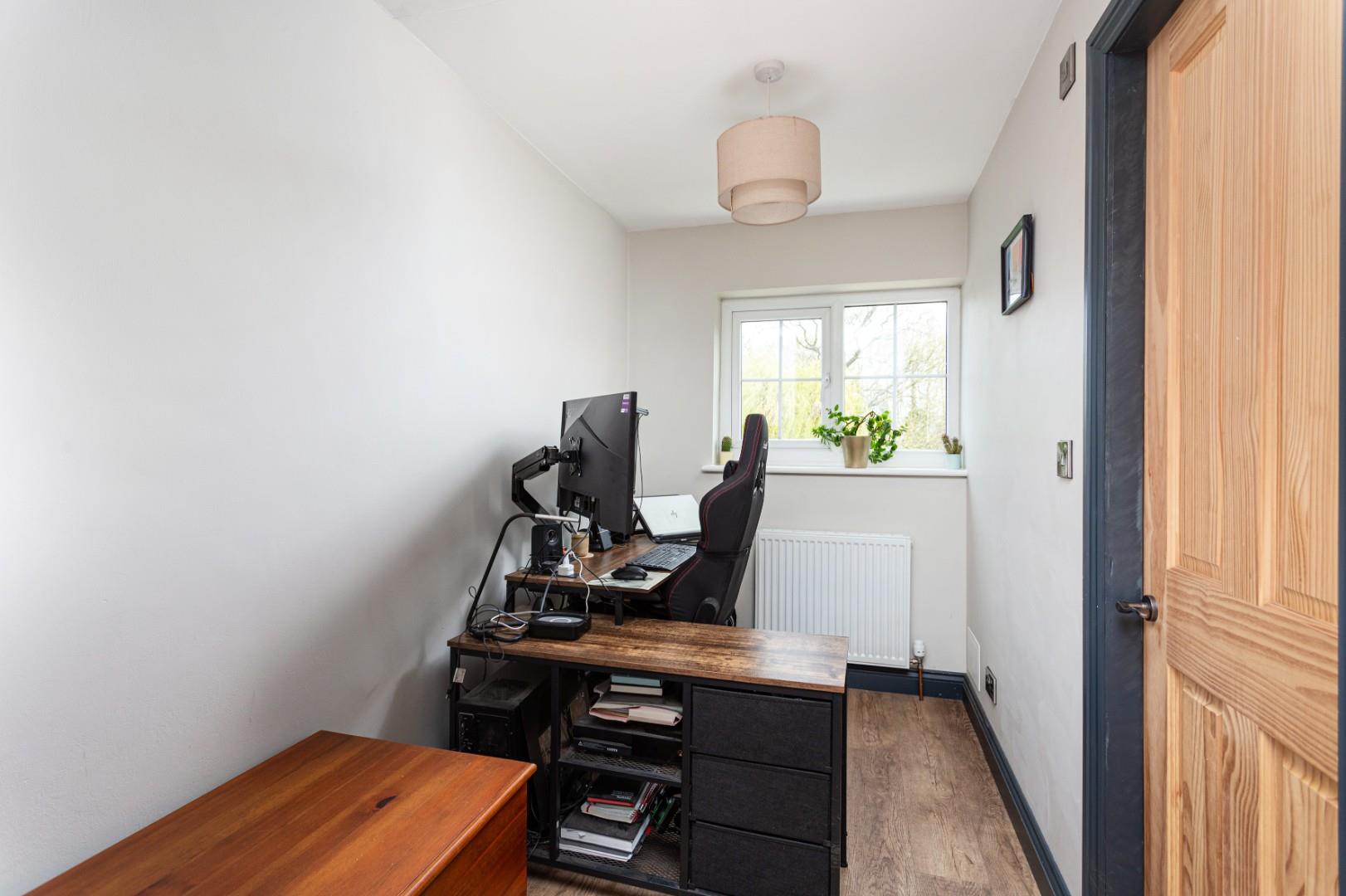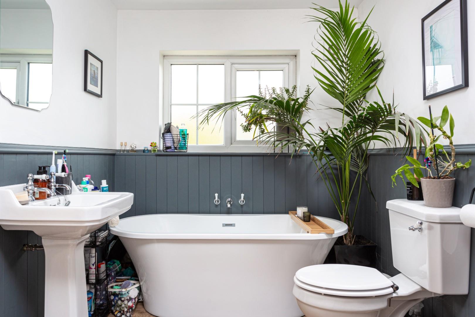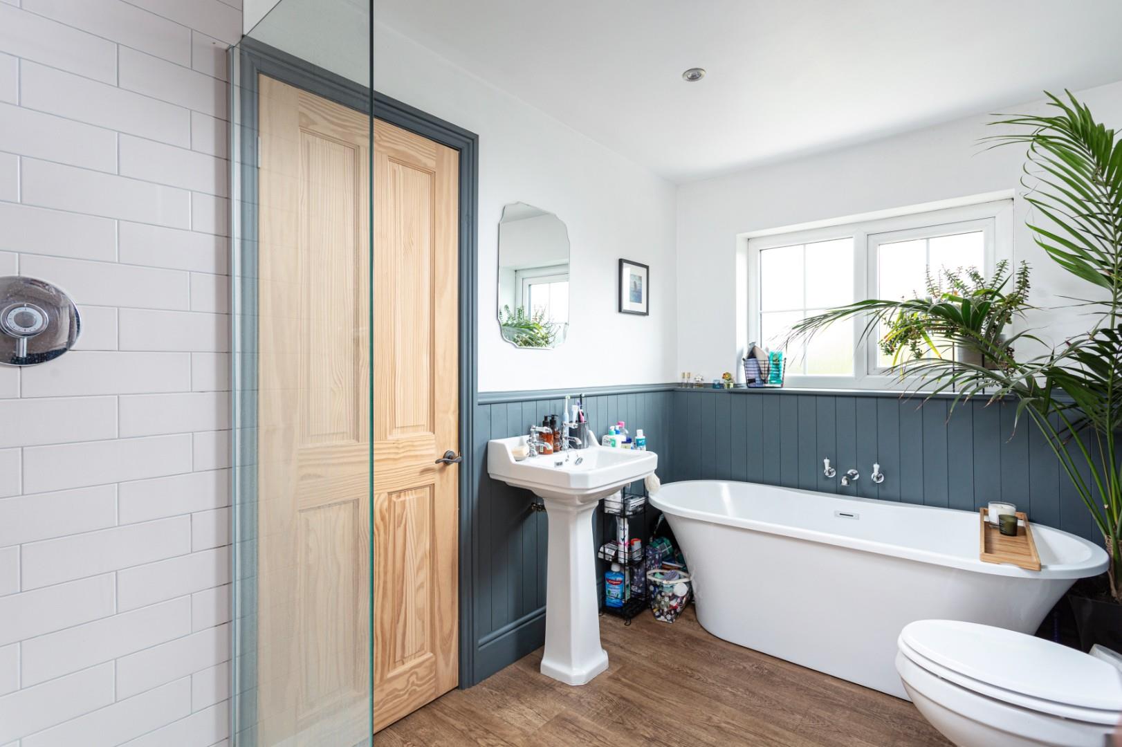 Upstairs, there are two well proportioned bedrooms along with a useful study area, offering flexibility for those working from home. The bathroom is a particular highlight, fitted to a high standard and designed as a standout feature of the home, with a four-piece suite including a roll top bath, a large walk-in shower and a quality finish throughout.