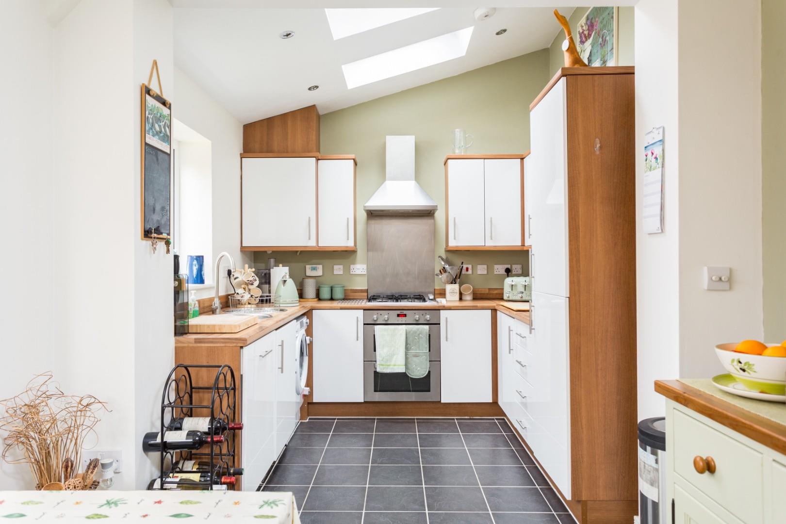 To the rear, the home opens up into a contemporary open-plan kitchen and dining area, enhanced by skylights and striking bi-fold doors that lead out to the west-facing garden. This impressive space is perfect for both everyday family life and entertaining guests, creating a seamless indoor-outdoor flow.