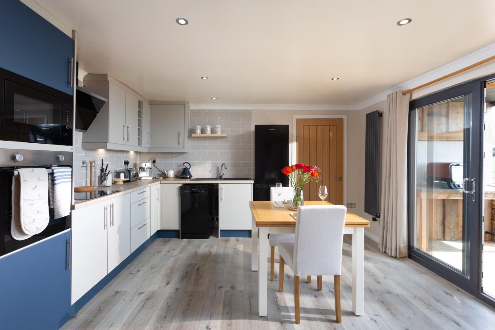 Inside The Show Pod - A practical "bootility room" with luggage storage and washing facilities welcomes you to Taras Sarn and the open plan dining kitchen and living area features a sensibly sized kitchen area, cozy living space and sliding glass doors that lead you out onto stunning terrace, complete with contemporary outdoor bath tub and breathtaking views across the mead and Vale of York beyond. The property features a spacious double bedroom and a stylish en-suite shower room with a larger than average walk-in shower.
