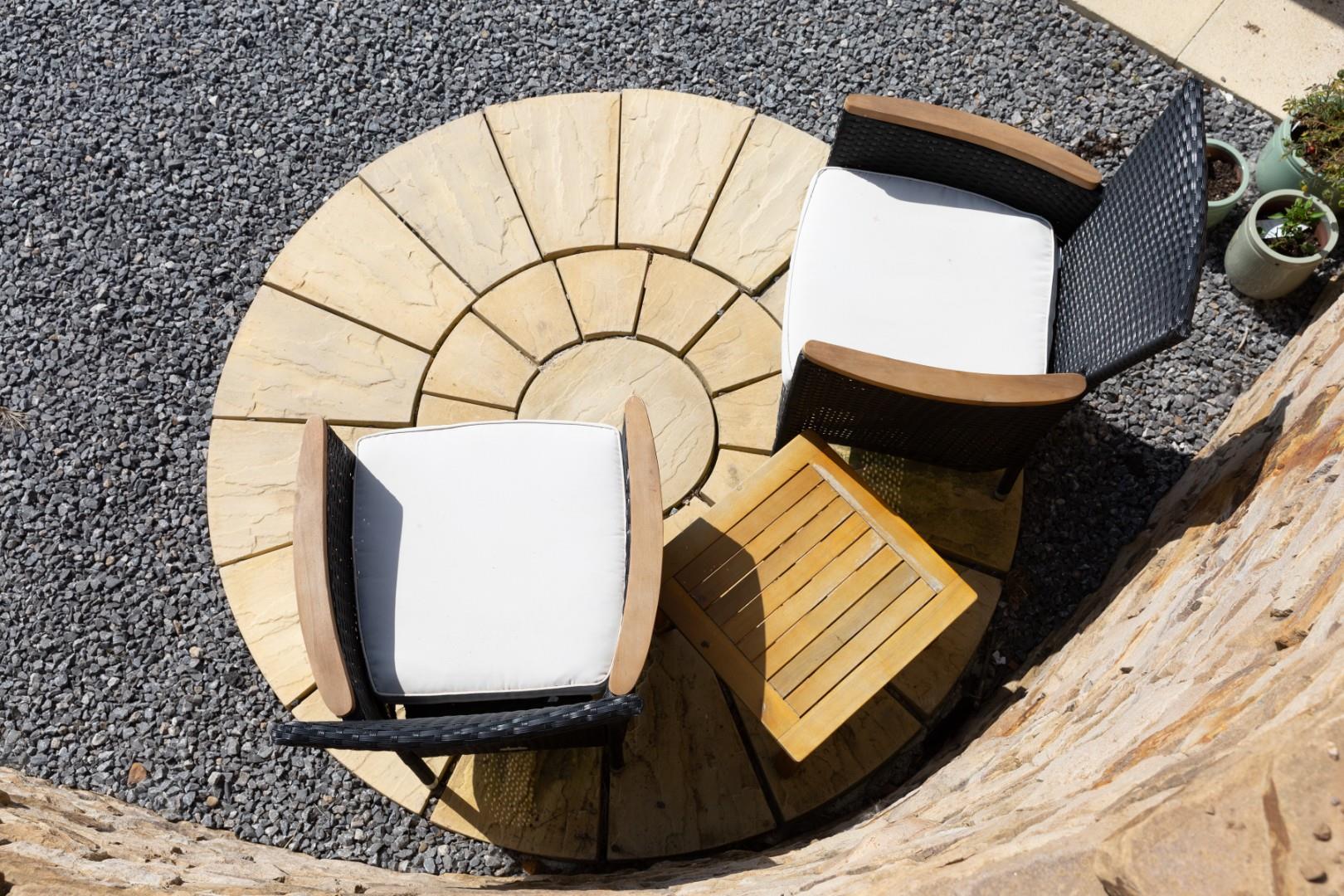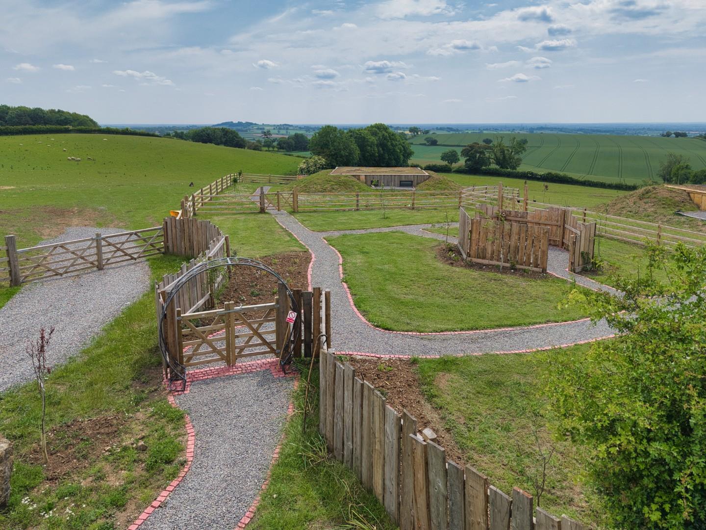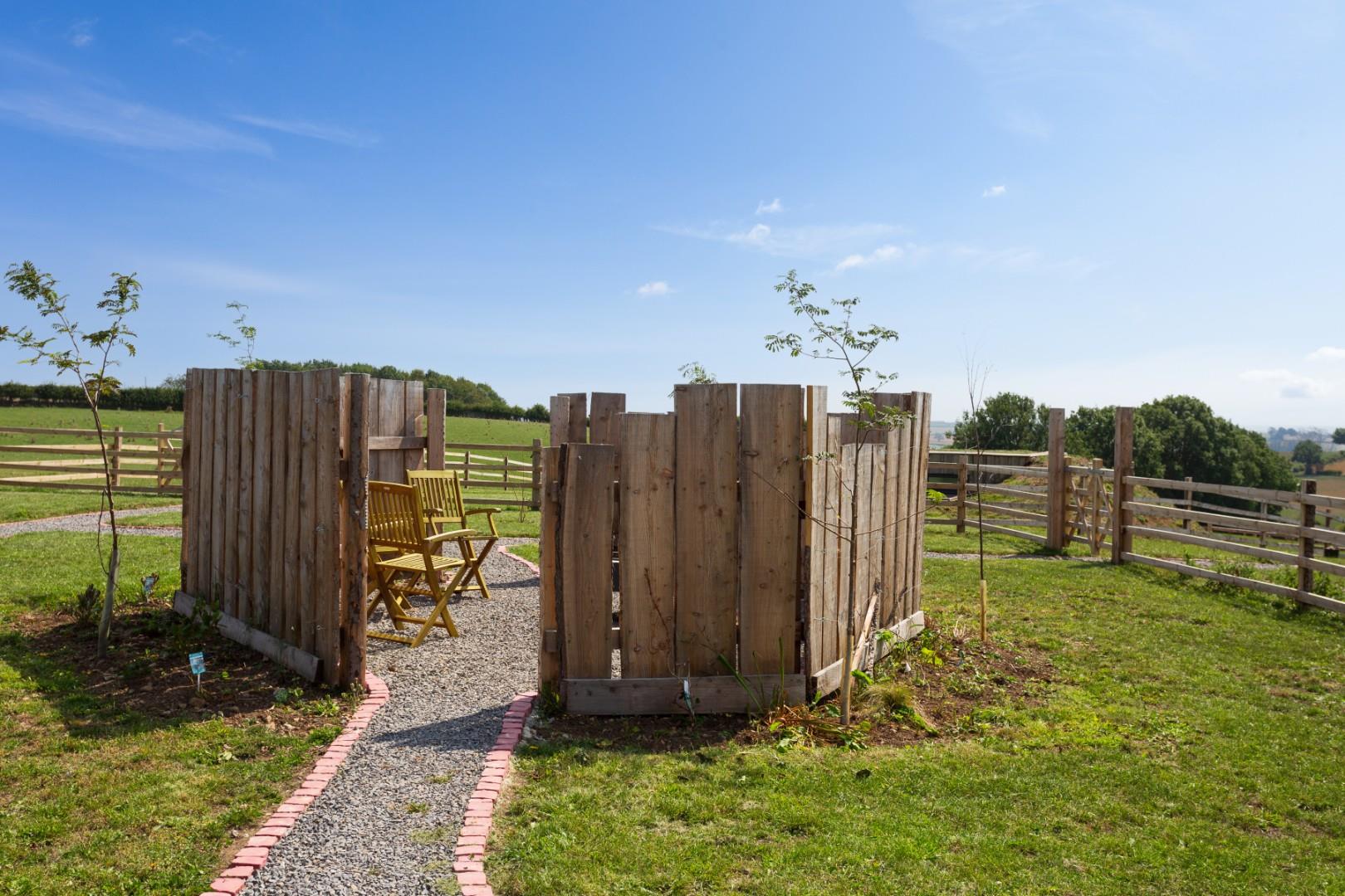 Outside The Show Pod - Each pod comes with an allocated parking space opposite the Farm Gate Farm Shop and a private gated access leads into a communal garden area for the 3 pods, which includes a sheltered fire pit and newly planted tree lined pathways leading down to the private gardens pf each pod. The show pod also comes with a wildflower seeded lawn and newly planted blossom trees.