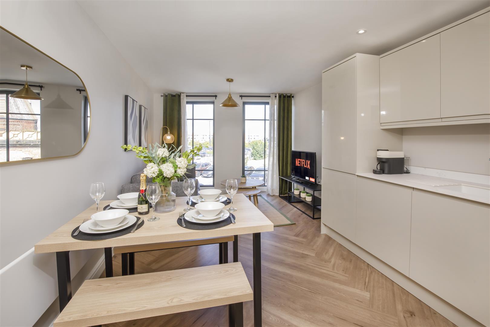 Each apartment boasts a Howdens sourced 'Clerkenwell Gloss Sandstone' range of units with integrated appliances and laminated white marble work surfaces complimented by varying Karndean flooring. Bathrooms and En Suites are fitted with Grohe sanitaryware and herringbone style feature walls.