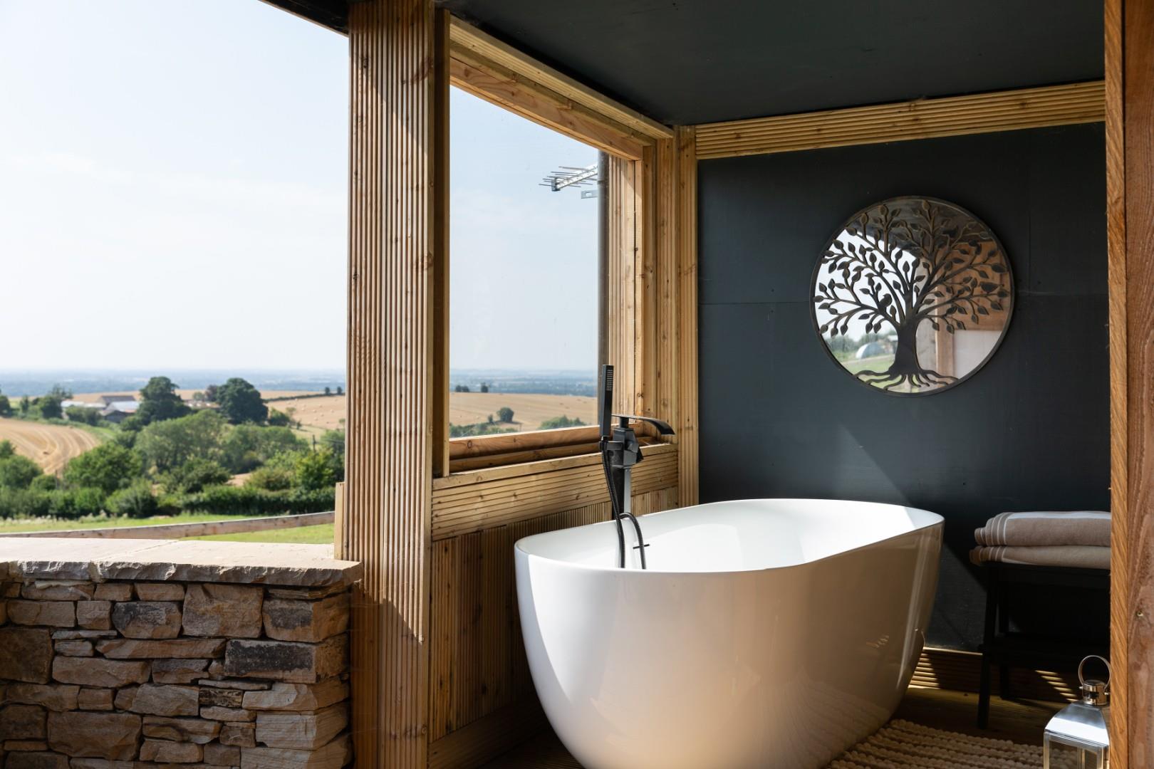 Inside Pod 1 Taras Sarn - A practical "bootility room" with luggage storage welcomes you to Taras Sarn and the open plan dining kitchen and living area features a sensibly sized kitchen area, cozy living space and sliding glass doors that lead you out onto a stunning terrace, complete with contemporary outdoor bath tub and breathtaking panoramic views across the Vale of York and beyond. The pod also features a double bedroom and a stylish en-suite shower room with a larger than average walk-in shower.