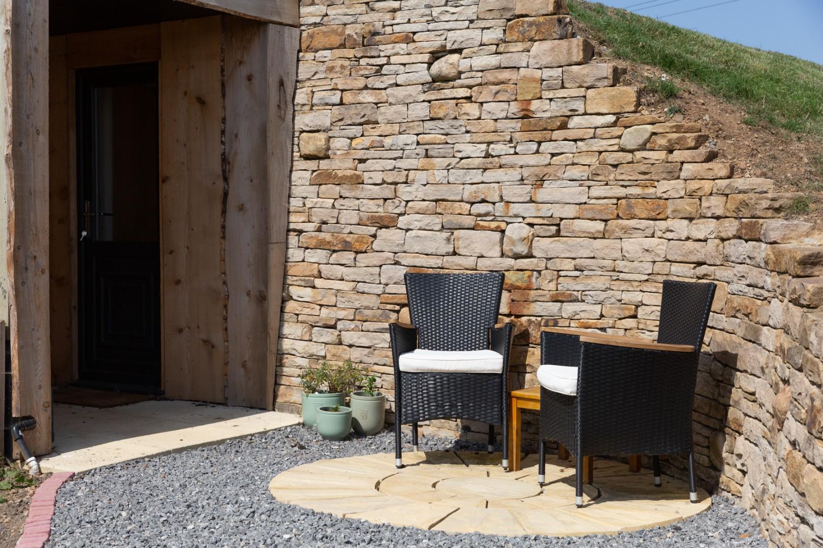 Outside Pod 1 Taras Sarn - Each pod comes with an allocated parking space adjacent to the Farm Gate Farm Shop and gated access leads you into a communal garden with a sheltered fire pit and newly planted tree lined pathways leading down to each pod.