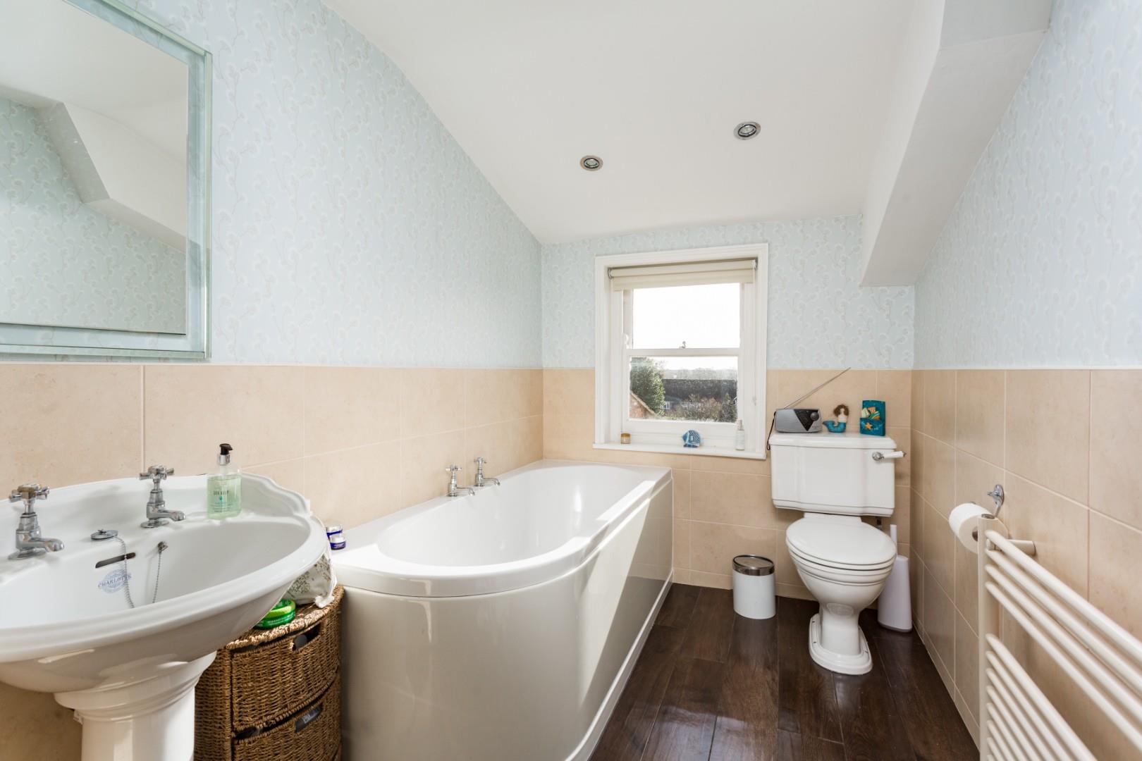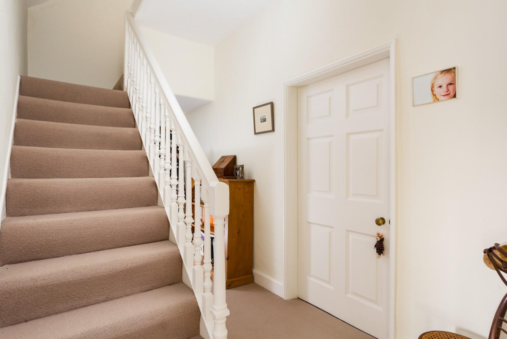 The first floor landing includes a linen cupboard and doors leading off into a beautifully proportioned principal bedroom with built-in wardrobes and a working open fire with ornate cast iron grate and 3 further bedrooms, 1 with a period fireplace and 2 with built-in storage and elevated rooftop views. The stylish house bathroom features a larger than average bath, heated towel rail, airing cupboard, complemented by a separate walk-in shower accessed from the landing.