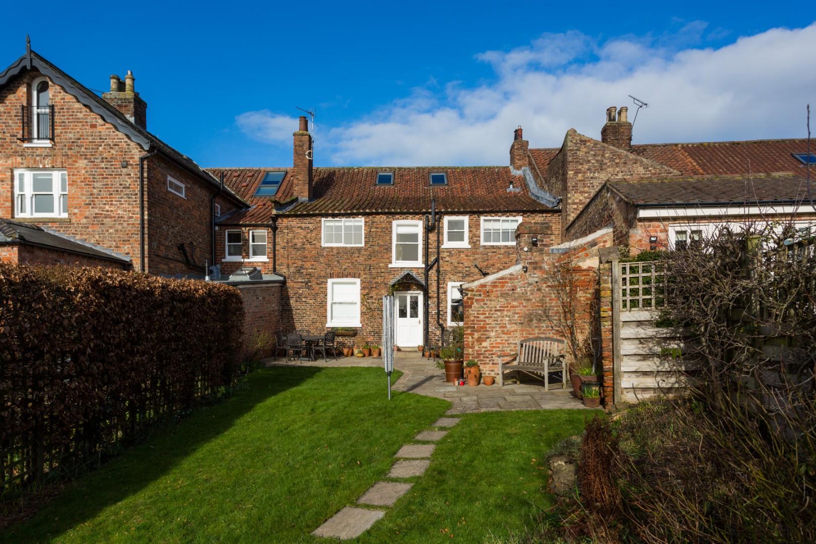 Beyond the paved seating area, the garden opens out to a lawn bordered by a raised herbaceous bed and gated access to a 22 yard (20m) long pathway with productive vegetable and soft fruit beds running alongside. At the far end, steps lead down to a brick built single garage, a designated wheelie bin area and a double width drive conveniently accessed via Back Lane.