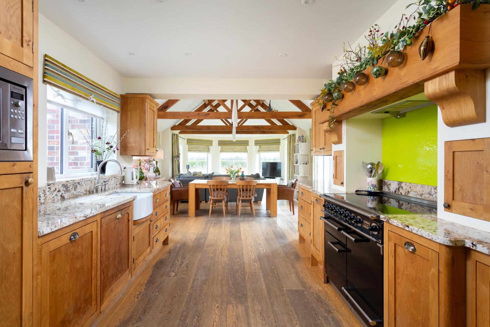 To the left of the hallway, you'll find a bespoke, handmade kitchen in Pippy Oak, complemented by granite worktops and a full range of built-in appliances. There is space for a Rangemaster style cooker, set beneath a striking oak beam with an extractor hood above.