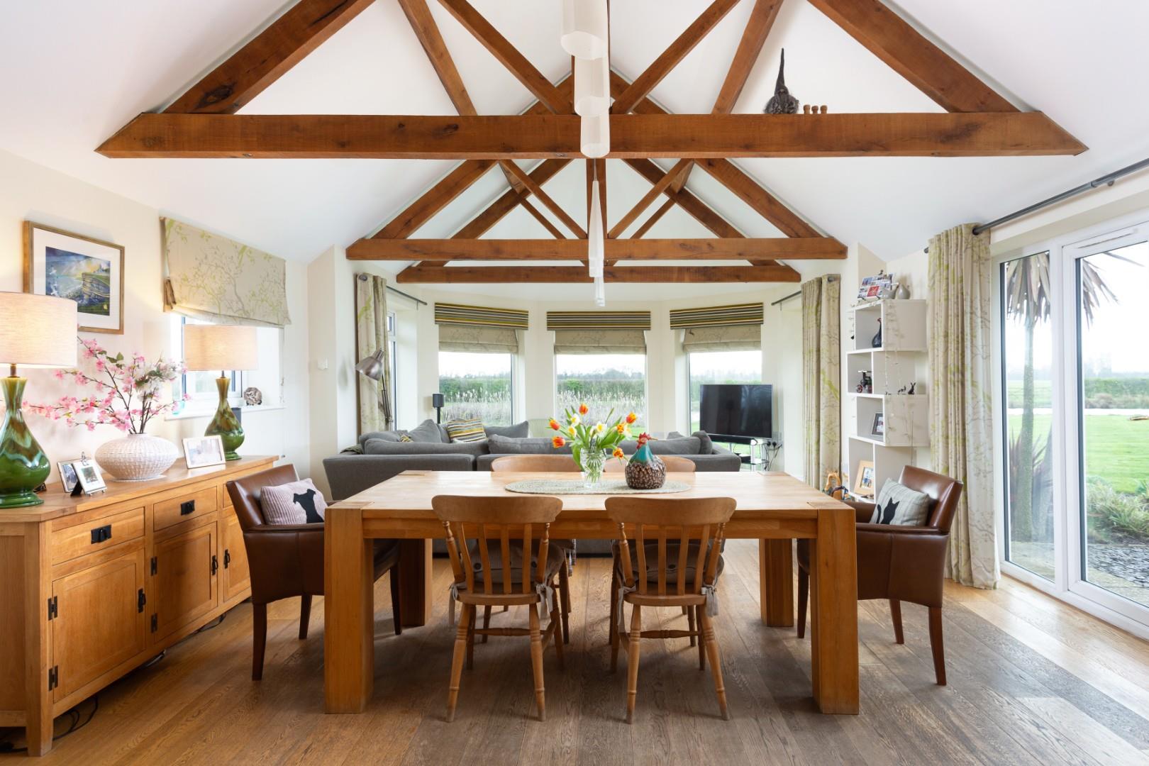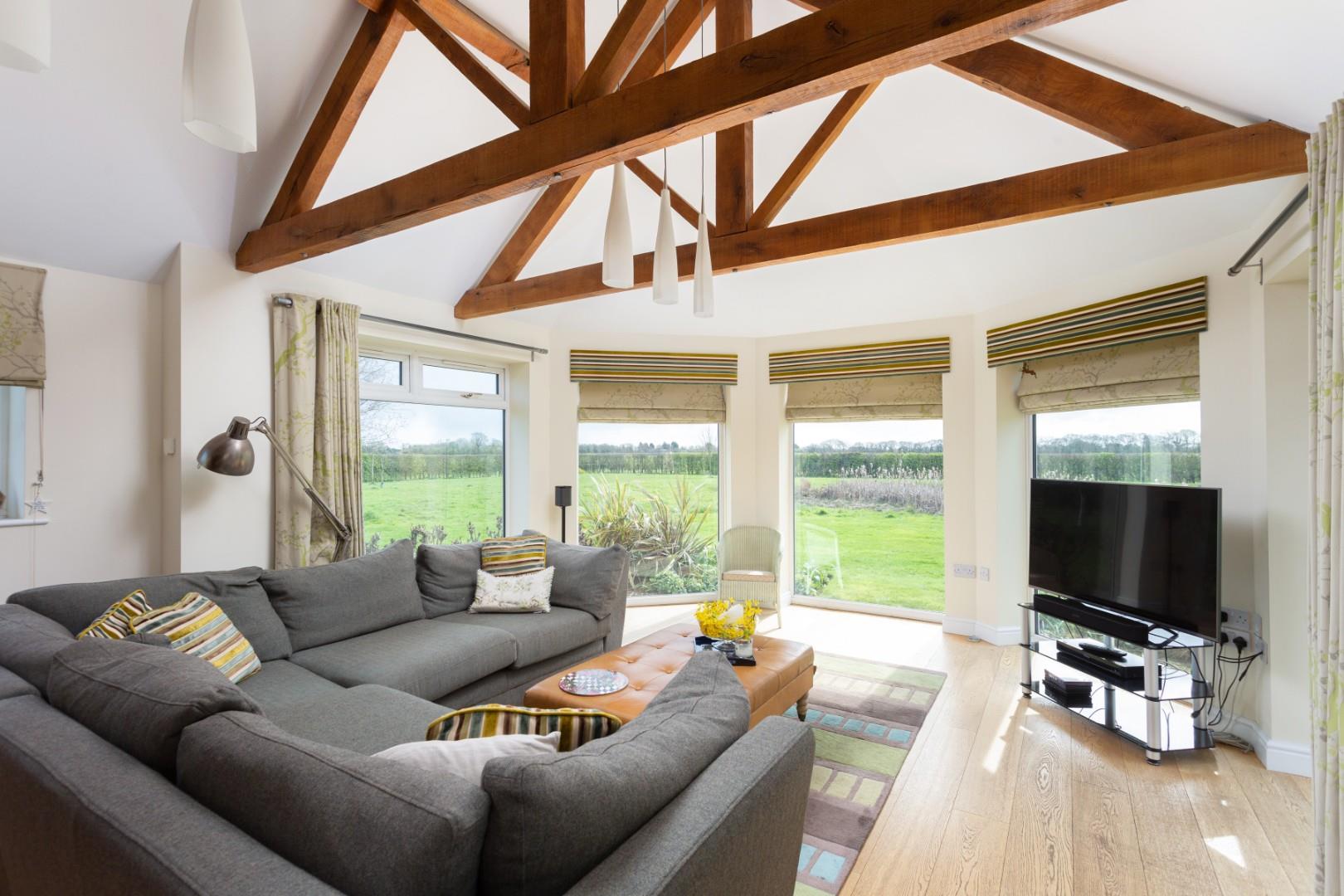 The extension, with its impressive 645 sq. ft. of living space, flows seamlessly from the kitchen area, offering an abundance of natural light through large windows and exposed oak beams that add warmth and character to the room. The architect's vision was to embrace the surrounding countryside, and they have done so perfectly, with panoramic views in every direction. This space is ideal for those who love to entertain, offering the perfect environment for gatherings, celebrations, or simply relaxing in comfort and style.