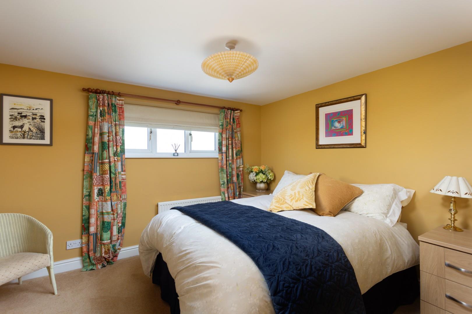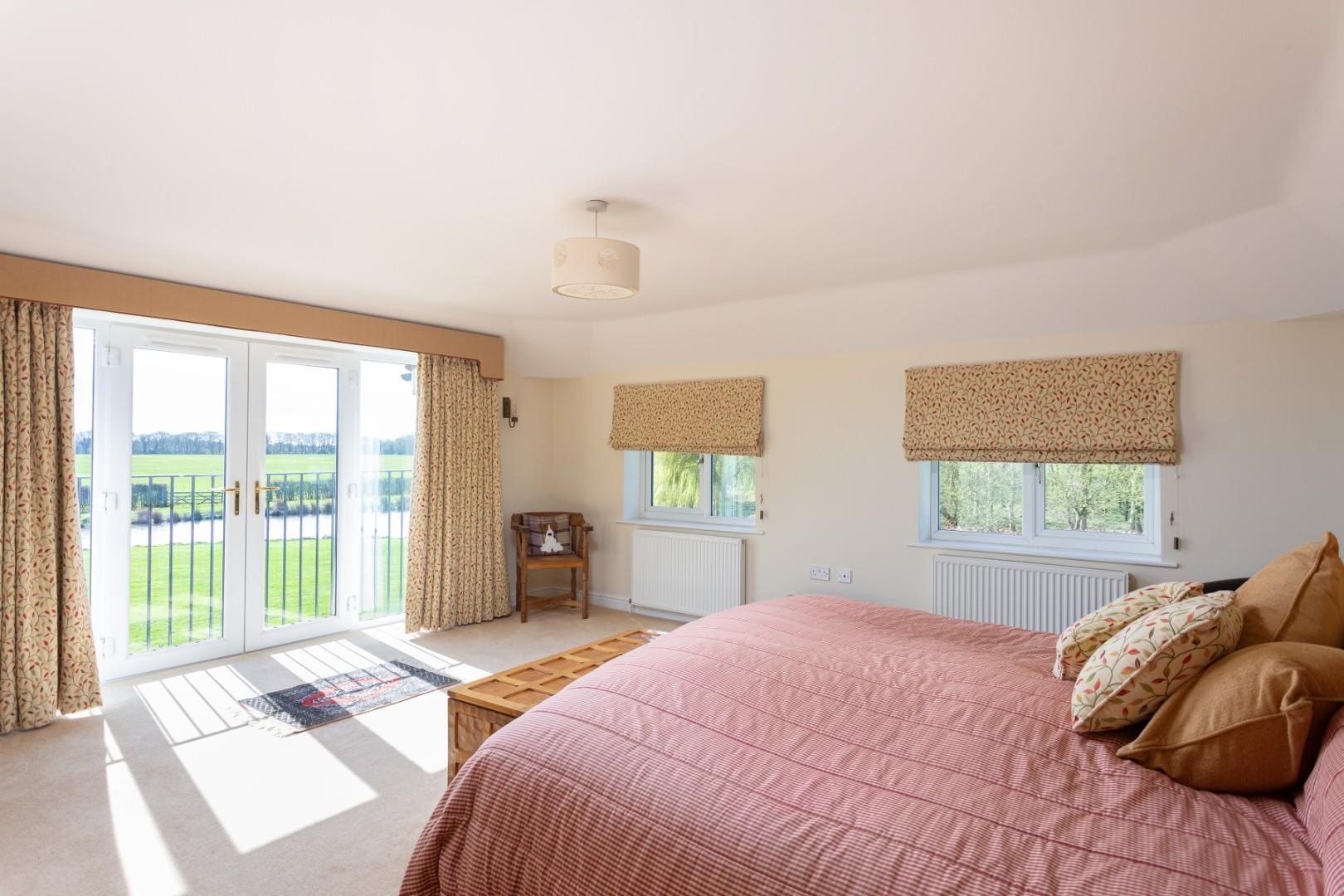 The principal bedroom is undeniably one of the standout features of the home. It not only offers a walk-in dressing room, with built in wardrobes to either side and en suite bathroom, but also showcases magnificent elevated views across the open countryside through a Juliette balcony. The bedroom itself is an impressive space, with a 300 sq. ft. area that steps down to create a sense of openness and grandeur. Two double-glazed windows to the side, along with the Juliette balcony and full-height glass panels on the rear elevation, flood the room with natural light, offering views across the fields.