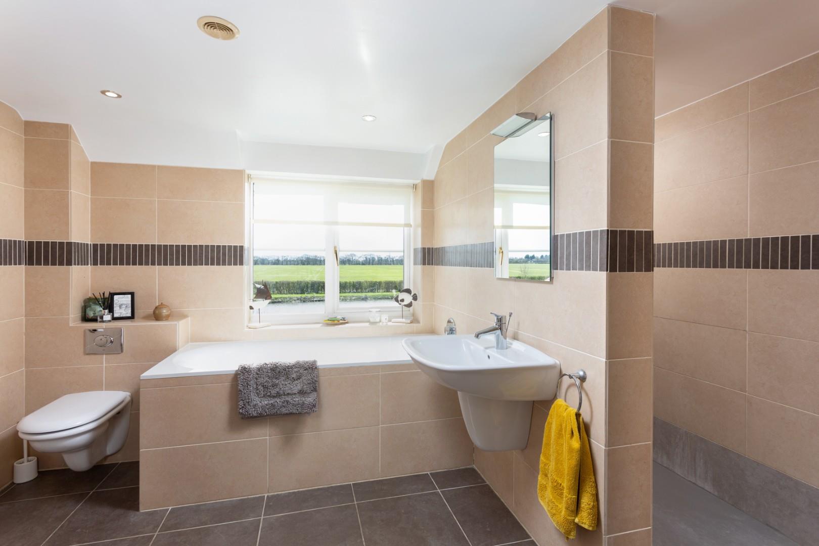 The internal accommodation is completed by a spacious house bathroom, thoughtfully designed with a panelled bath, half-glass screen, and shower attachment overhead. A pedestal hand wash basin and low flush WC complement the space, while half-height tiling adds a touch of elegance. A frosted double-glazed window to the rear elevation ensures privacy while allowing natural light to fill the room.